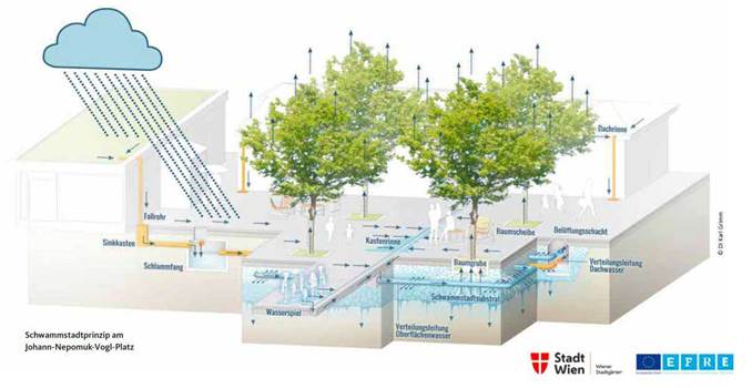 Außerdem schreckt Mödling nicht davor zurück, versiegelte Flächen wieder zu entsiegeln und versucht das Prinzip der Schwammstadt im öffentlichen Raum umzusetzen.