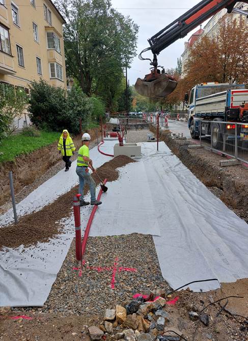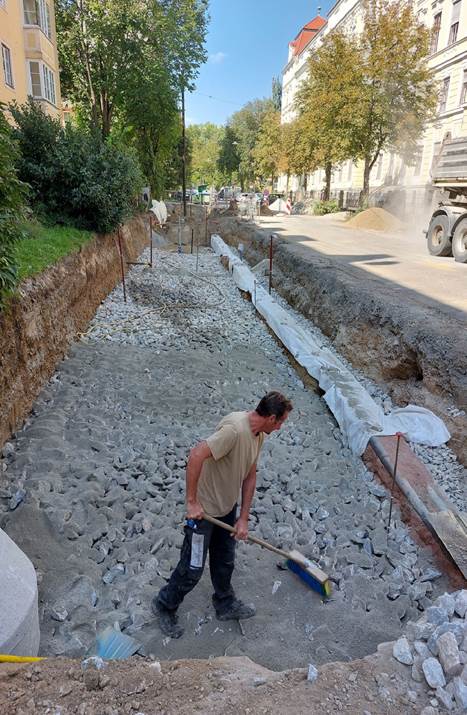 2017 wurden in Graz die österreichweit ersten Bäume in diesem von unseren schwedischen KollegInnen entwickelten System gepflanzt. Dieser großzügige Wurzelraum, der in mehreren Schichten aus Grob- und Feinschotter, Pflanzenkohle und Kompost aufgebaut wird stellt den Bäumen langfristig und stabil Luft, Wasser und Nährstoffe bereit.